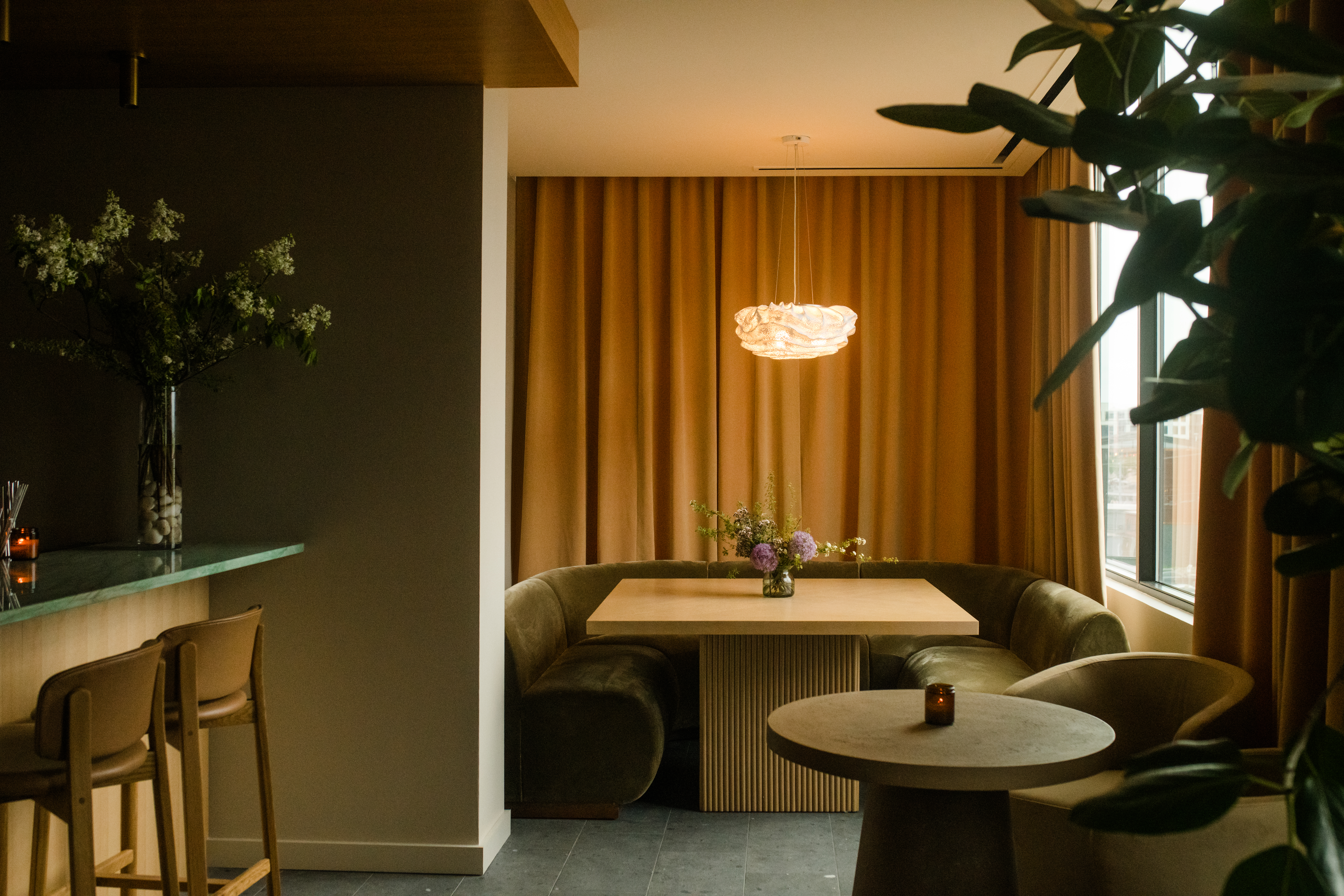 Floor-to-ceiling windows allow natural daylight during prep, with sheer drapery transforming the space into a more controlled, intimate environment at night.